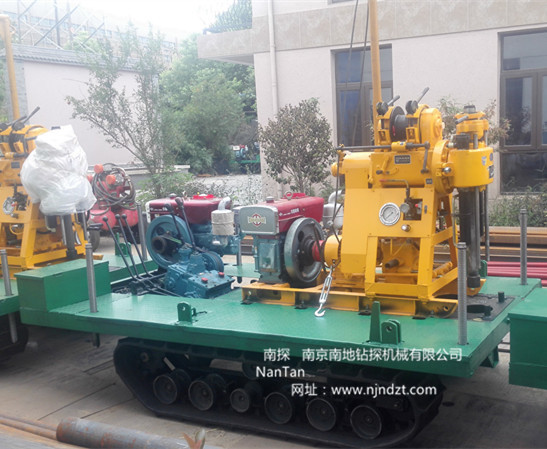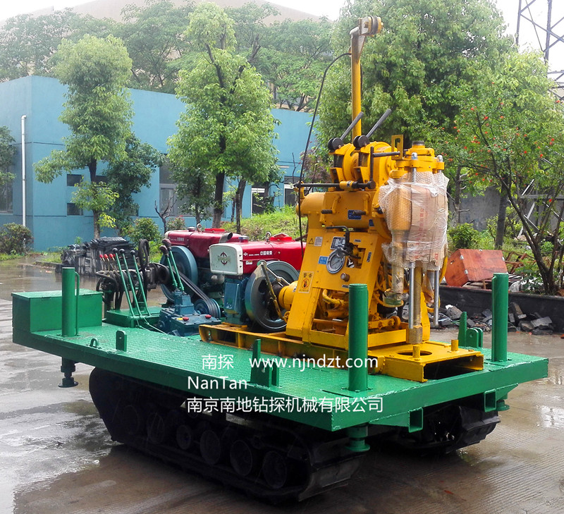 一、簡(jiǎn)介 XY-1-L-01-A(B)型履帶鉆機(jī)及人字形四角架鉆塔,是將橡膠履帶底盤、動(dòng)力(柴油機(jī)或電機(jī))、鉆機(jī)、A型為4組手動(dòng)支撐腿B型為4組液壓支撐腿、鉆機(jī)平臺(tái)、6米高人字形四角架起落鉆塔、水泵等共同組裝在一個(gè)機(jī)架上。鉆機(jī)、水泵一個(gè)動(dòng)力(柴油機(jī)或電機(jī)),橡膠履帶底盤一個(gè)動(dòng)力(柴油機(jī)或電機(jī))帶動(dòng),互不干擾。該機(jī)型具有爬坡能力強(qiáng)、鉆進(jìn)和行走穩(wěn)定可靠、載重質(zhì)量大等優(yōu)點(diǎn),適用于地質(zhì)、冶金、煤炭、水文、建筑工程、水電工程、公路、鐵路、港口、城建、橋梁、壩基等建筑物的工程地質(zhì)勘察、淺層探礦、礦山坑道、水井、小型灌漿孔、爆破孔等的鉆進(jìn)。該鉆機(jī)是適應(yīng)新型市場(chǎng)需求不可多得的理想設(shè)備之一。可在海灘、河灘、沙地、水田等惡劣環(huán)境開展靜探作業(yè),結(jié)冰道路仍可行走。